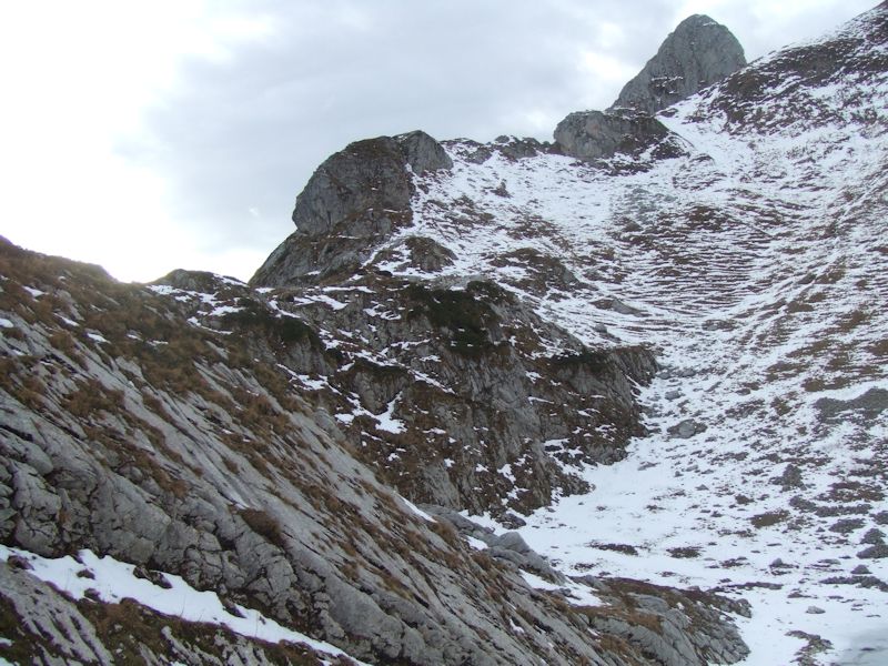 he's crossing our path, heading up the lapiéz (or carved-out limestone rocks), towards the hidden bowl and little lake called