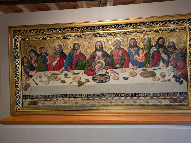 The Last Supper, solving the "where do you put the halo when they're facing away" problem, but Judas doesn't get a halo anyway. This is in the Museum Unterlinden in Colmar, with its fabulous collection of panels by Martin Schongauer (ca.1445-1491), a native son of Colmar [viewed in 2016].