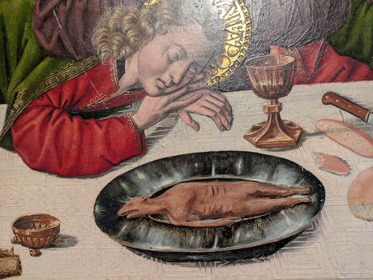 . . . but in the whole huge fresco in the 'Corridor of the Last Supper' we find many main dishes set out, all similarly unidentifiable. The fresco is attributed to Bartolomeo Coda or his dad Benedetto, first half of the 16th century, and is now in the Museo della Città in Rimini. It's not a very intimate setting for a last supper, in an era before electronic amplification. Viewed in December 2017