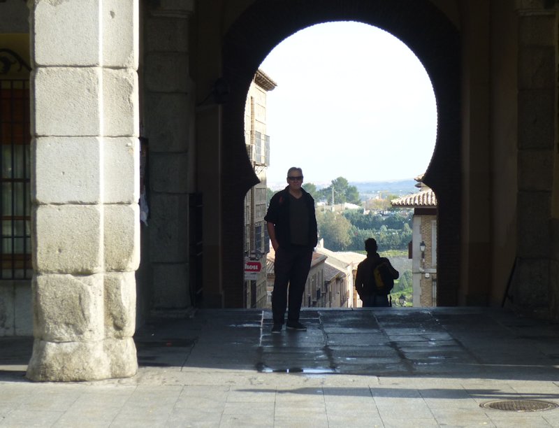 The modern road winds up to the left of the Mudéjar-style Puerta del Sol or Sun Gate just ahead -- that entrance to the city, in its turn, was built in the 14th century because the older Islamic-era Balmardón gate, straight up the hill behind the buildings on the right (a gate in which, two days later, we would have lunch) turned out to be impassable for wagons of the era.