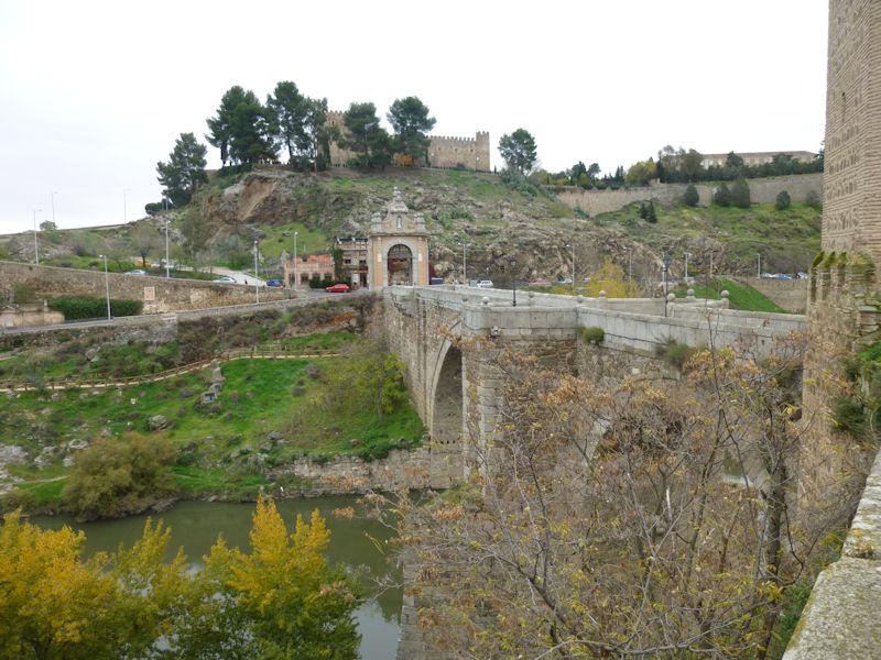 The Alcántara bridge had Roman origins and was maintained by the Visigoths and Arabs as the only bridge over the river throughout that time; the fortifications directly above it on the city side show how vital it was to the defense of the city.
