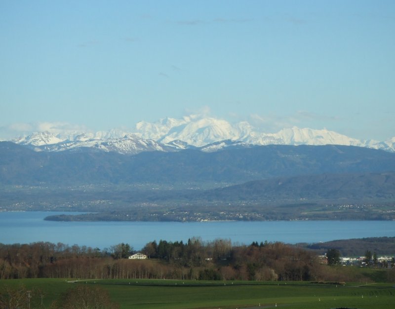 du Midi on the left, Mont Blanc on the right, Yvoire on the shoreline across the
