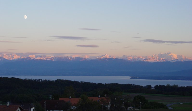 Dents du Midi at the end of the lake, moon rising, 6 October 2003