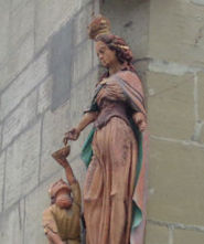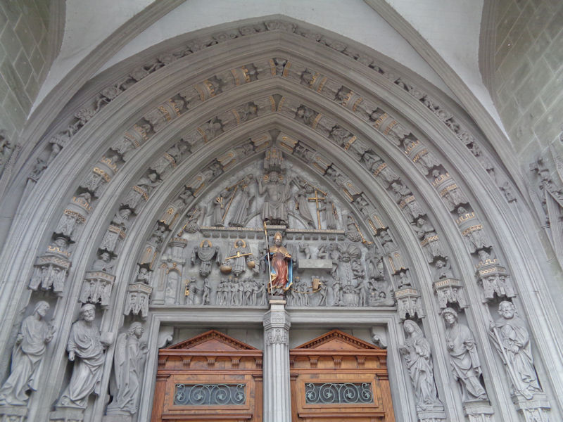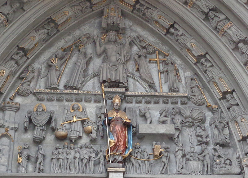 In the tympanum over the front doors, the Last Judgment, with the angel weighing souls in a balance, the relieved 'virtuous' being led off to our left by Peter with his golden key, and the Losers being scurried off to the right by beasts and ghouls. Colorfully in front of all that, St Nicholas of Myra, all from the late 14th century.