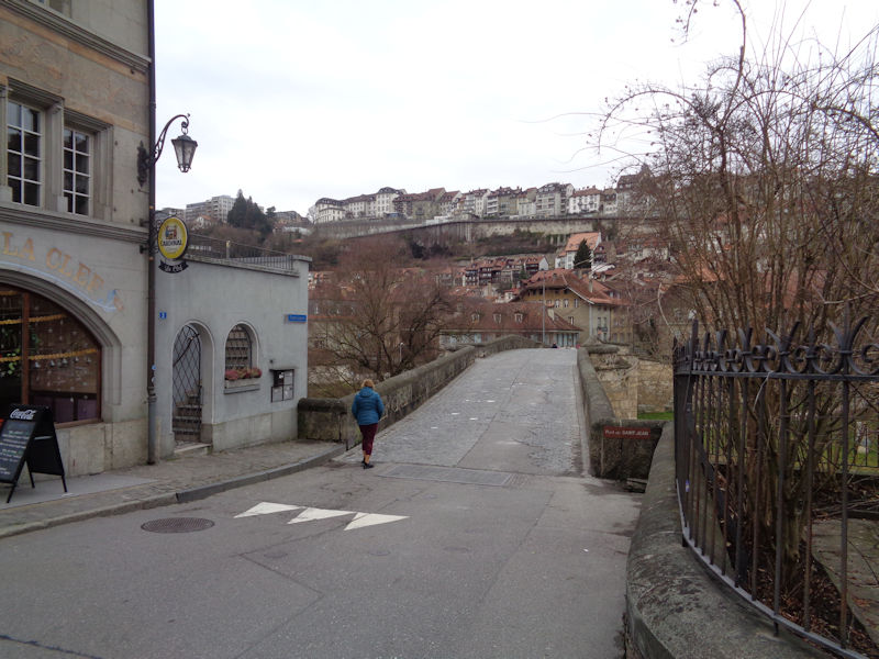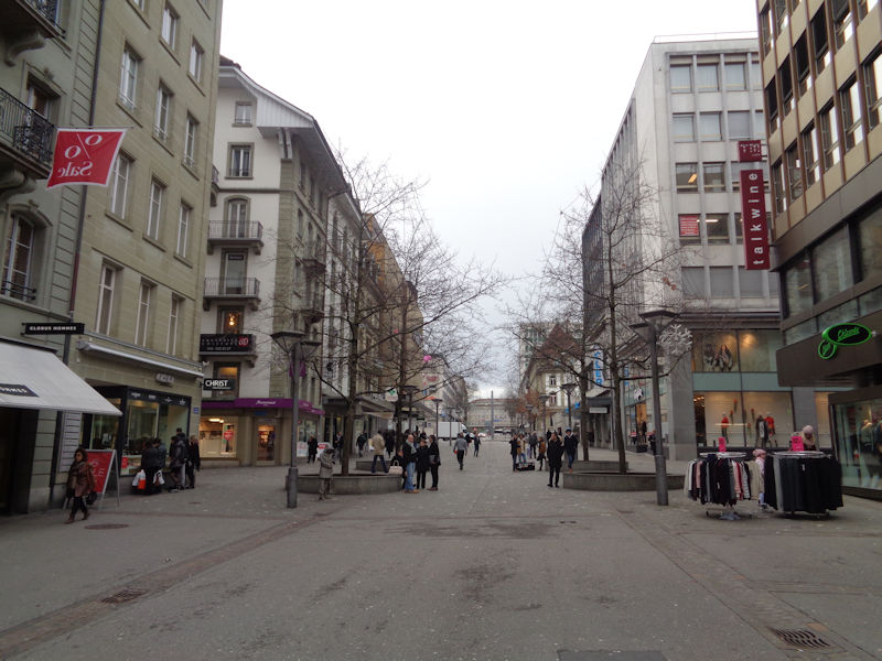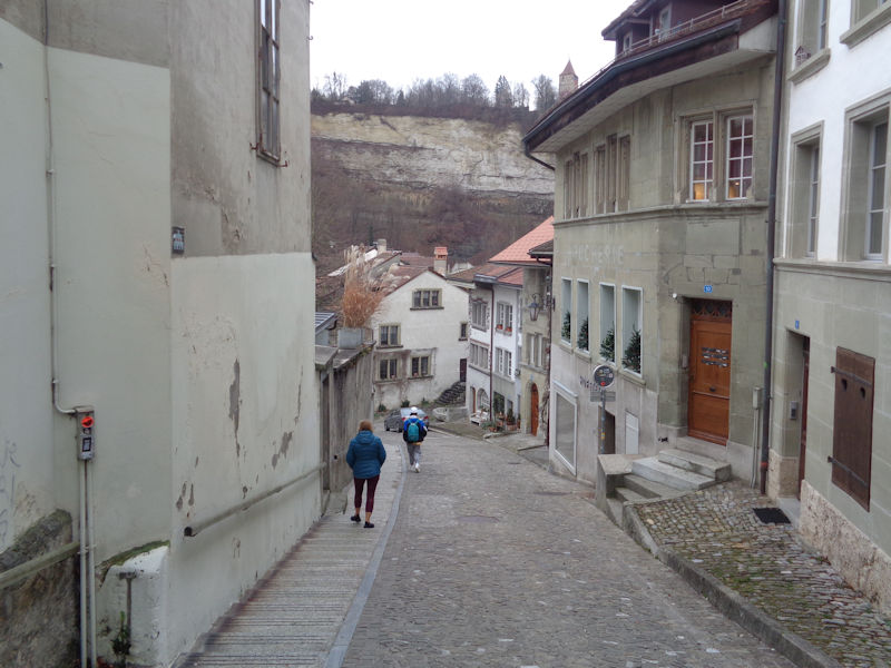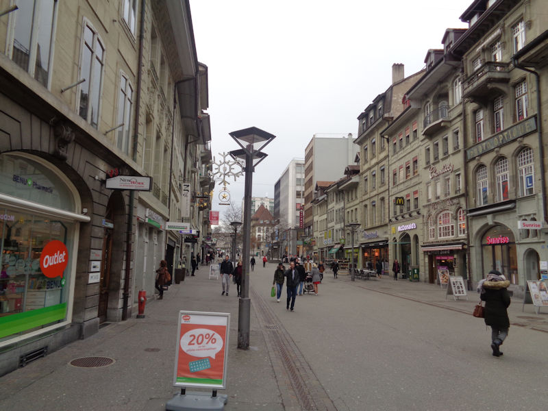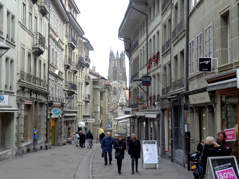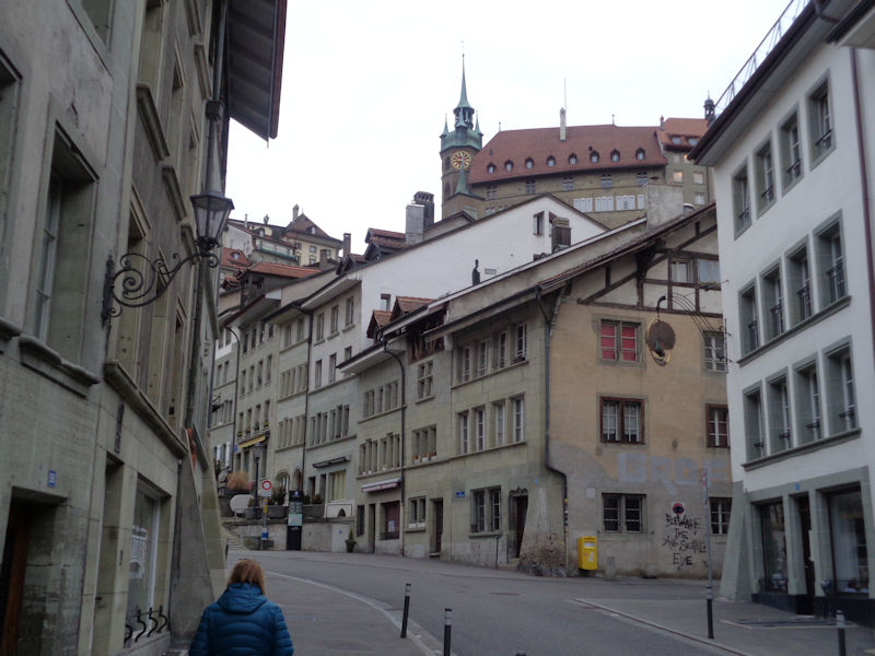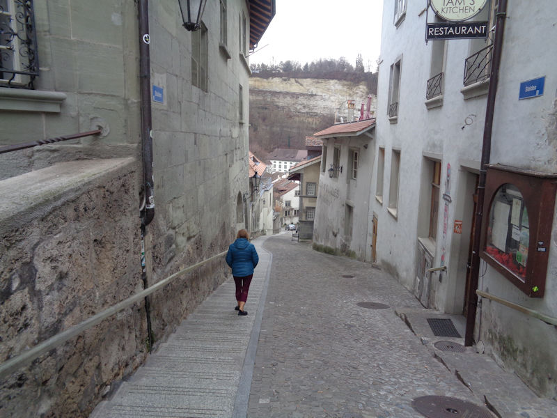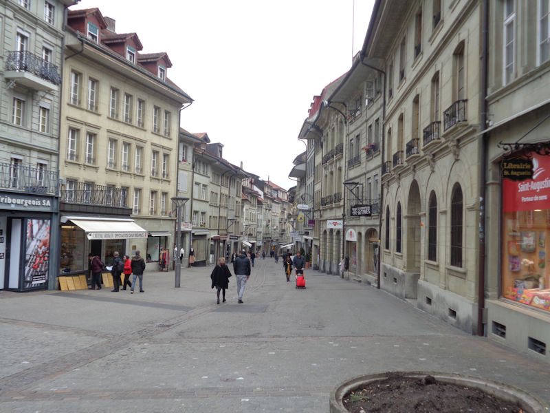 We're on the Rue de Romont in Fribourg, 10 January 2018, looking back towards the main train station, but in fact we're bound the other way, down towards the historic city centre.