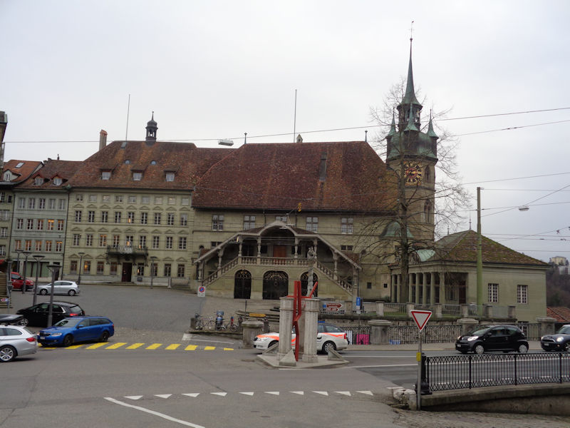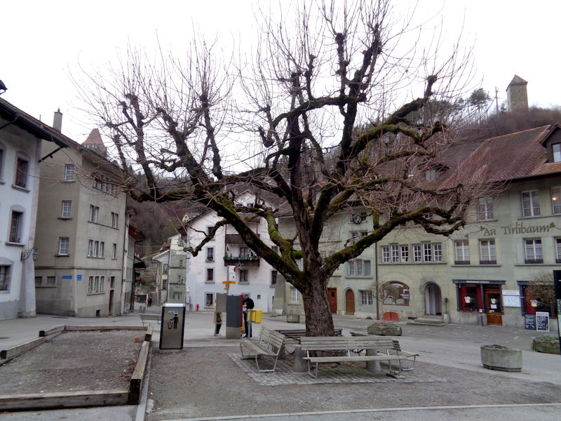 The Rue de Lausanne merges into the Place de l'Hôtel de Ville, with the city government offices, and with (behind the yield sign) the 'Tilleul de Morat', the linden tree planted in 1476 to commemorate the runner who ran to announce the Swiss victory over Charles the Bold's Burgundian army and collapsed here from his exertions. The tree is said to be descended from the linden twig the earnest gentleman had been wearing in his hat.