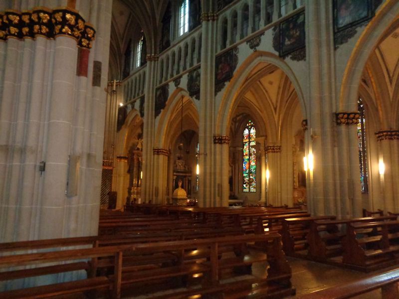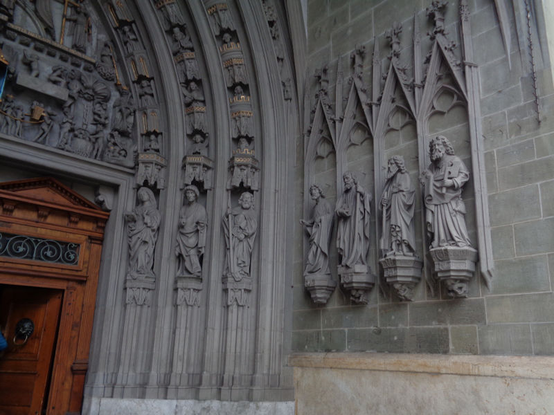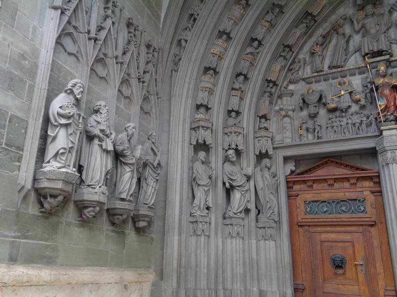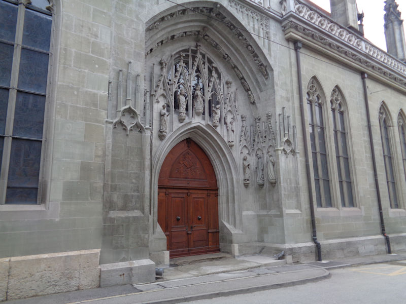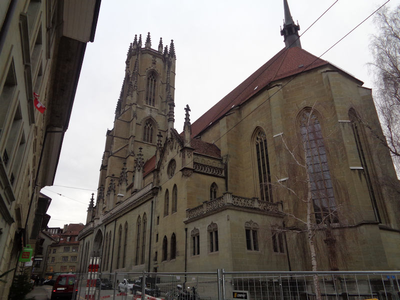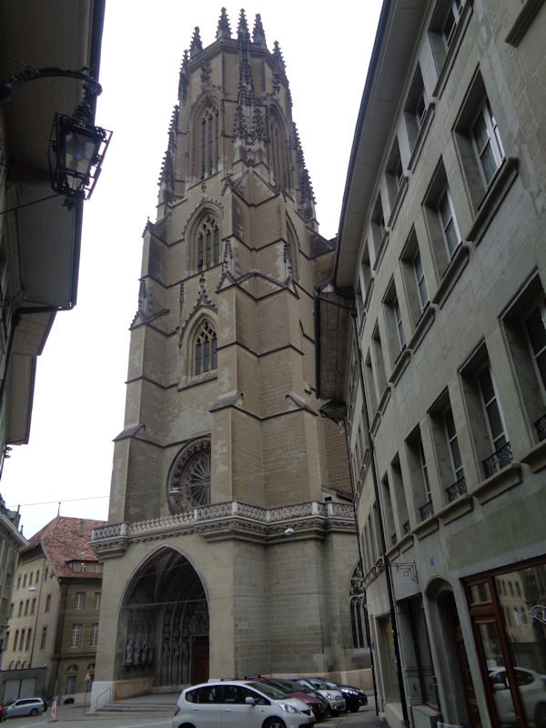 Out the front door of the cathedral, facing the Basilica of Notre-Dame of Fribourg in the Place de Notre-Dame