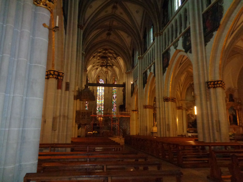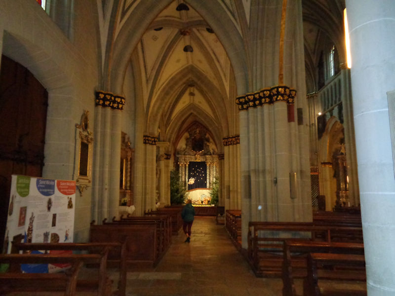 The nave with five bays -- construction of the cathedral began as a parish church in 1283 and finished in about 1430; it was elevated to a collegiate church in 1512 and to the status of cathedral in 1945. It is presently the seat of the Diocese of Lausanne, Geneva and Fribourg.