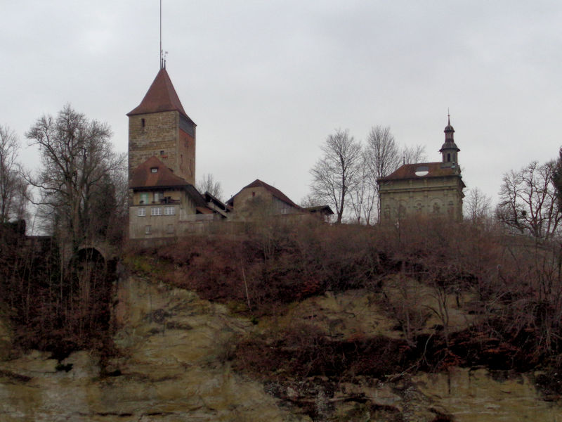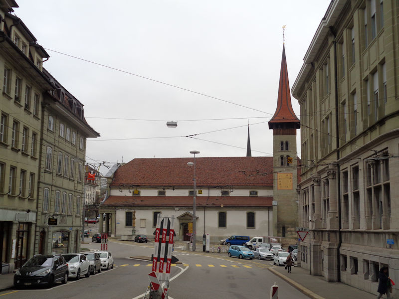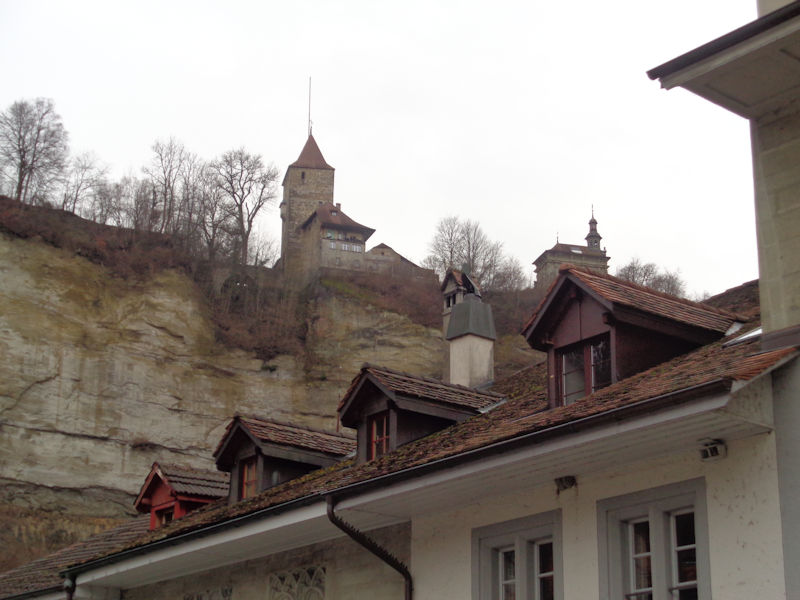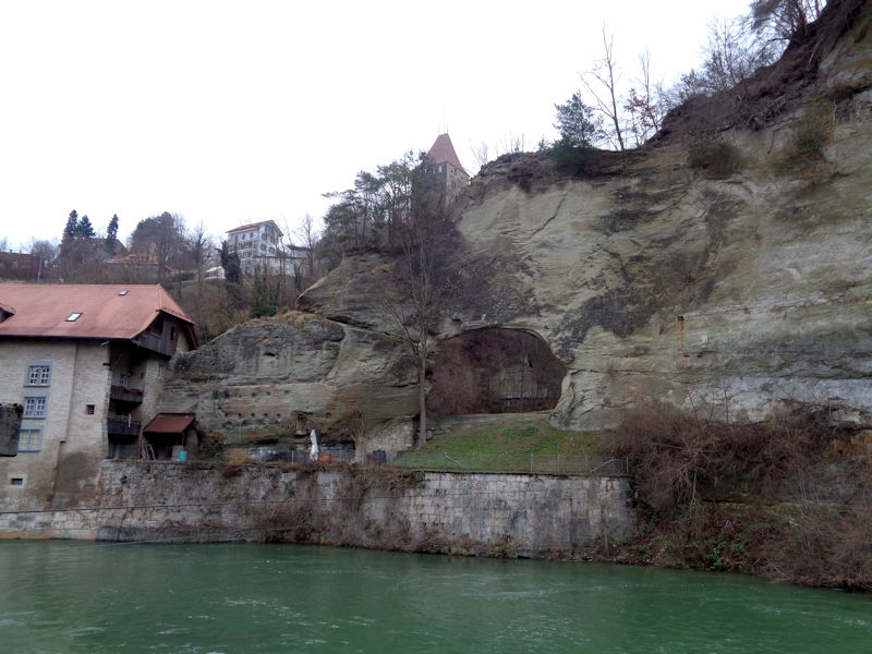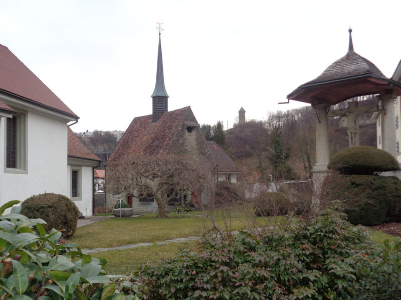 On the far side of the river Sarine, this is the 16th century Tour de Bourguillon over a suburban city gate, and the baroque Chapelle de la Lorette (1647) on the right, described as a smaller reproduction of the Santa Casa de Loreto in Italy.