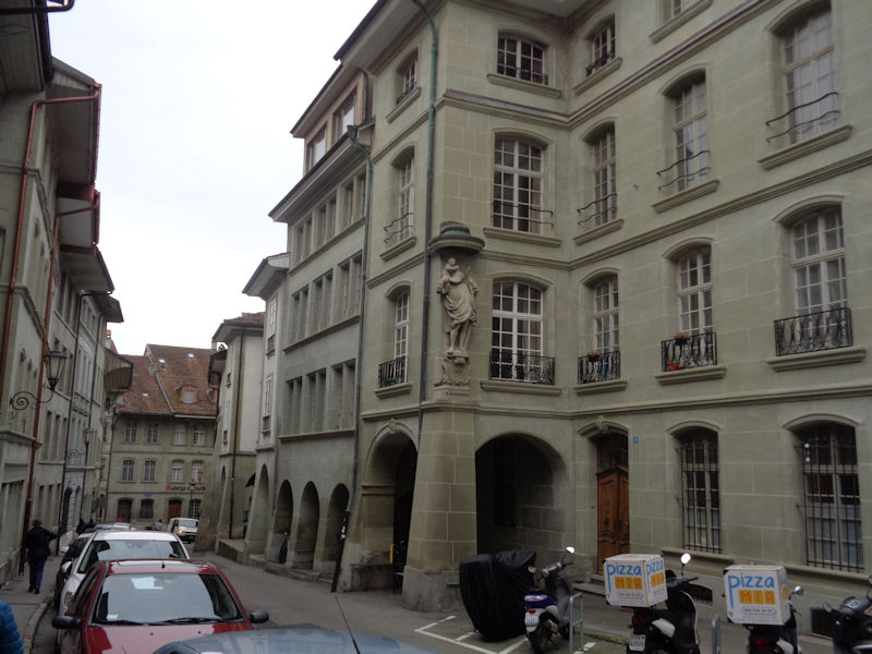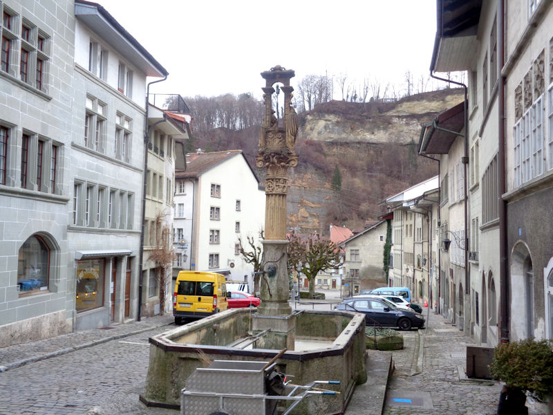 And now we're starting down the hill: the Rue de Romont has become the Rue de Lausanne. Few Neolithic or Roman remains have been found near Fribourg, but its naturally defensible location with the cliffs of the river Sarine protecting it on three sides attracted the Duke of Zähringen, who founded the city here in 1157. Duke Berthold IV, whose family came from the Zähringen castle near Freiburg in southwestern Germany in the 11th century, was a follower of Frederick Barbarossa and held extensive family lands in western Switzerland as well as in Germany.