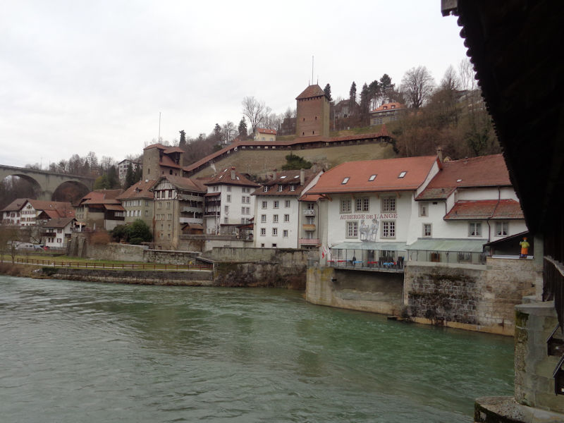 Fortifications along the hillside on the far side of the Sarine