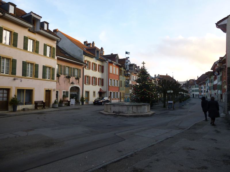 The village school, with the highway running through it. There were people here from the earliest times, but the fortified villages dates from the early 14th century, built by the Counts of Neuchâtel to cover the eastern approaches to their domain.