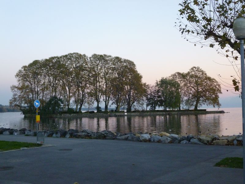 The artificial Île de la Harpe is the only island in Lake Geneva, except for Queen Victoria's tree at one end of it and the Île de Rousseau in the river Rhône in downtown Geneva.