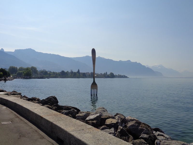 La Fourchette, the Fork, made in 1995 for the 10th anniversary of the Alimentarium, the 'museum of food' devoted to the history of Nestlé, whose world headquarters is just farther along the shoreline. Taken down after the anniversary, it was restored permanently after petitions from the public. According to Wikipedia, the 8-metre 'Fork of Vevey is a Guinness World Record holder as the world’s tallest fork'.