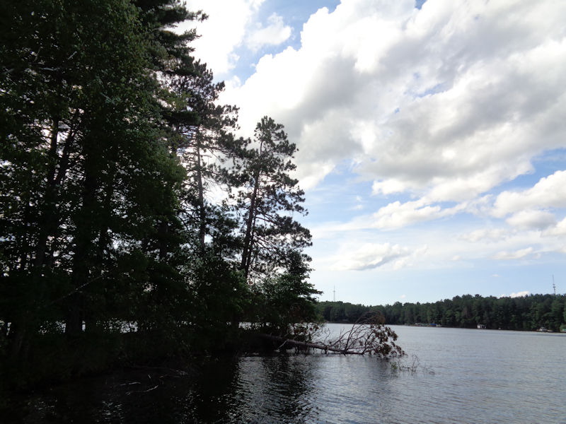 A rocky reef off Pradt's Point, and tag alders suffering in the higher lake levels; the central island of Adjidaumo in the background.