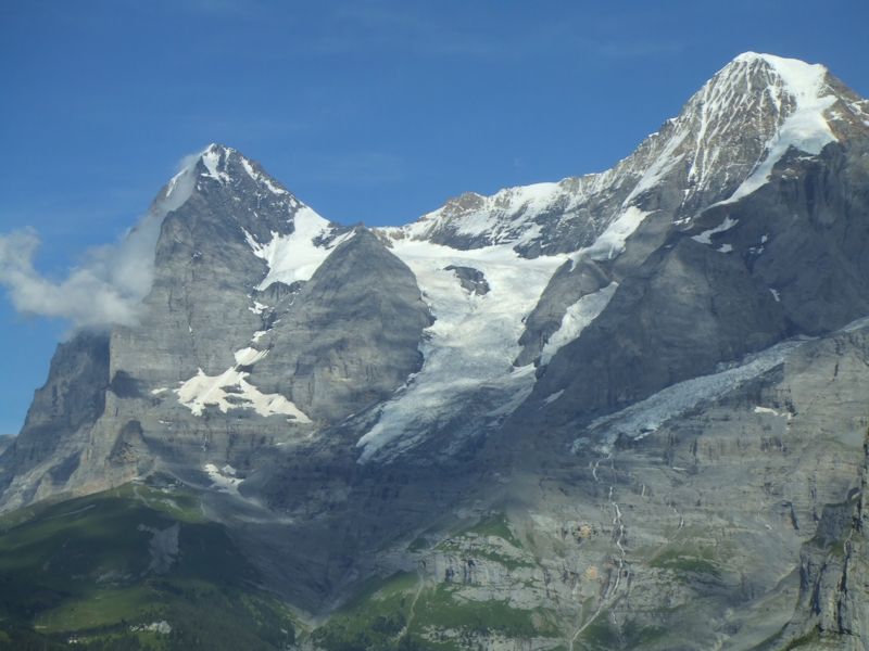 Kleine Scheidegg above Grindelwald on the far grassy ridge, with the north wall of the Eiger and the Eiger glacier, and the Mönch on the upper right.