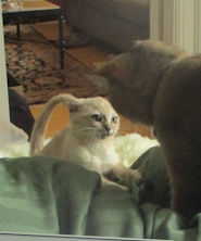 Melvin appears to be urging calm, or a truce. Melvin, a Selkirk Straight, has limited vocal abilities and over the past year has scarcely uttered a sound, except when accidentally stepped upon, but since the advent of his little friend, who shouts and yammers almost continuously, Melvin has begun speaking out as well. Though with nothing like the same decibel level.
