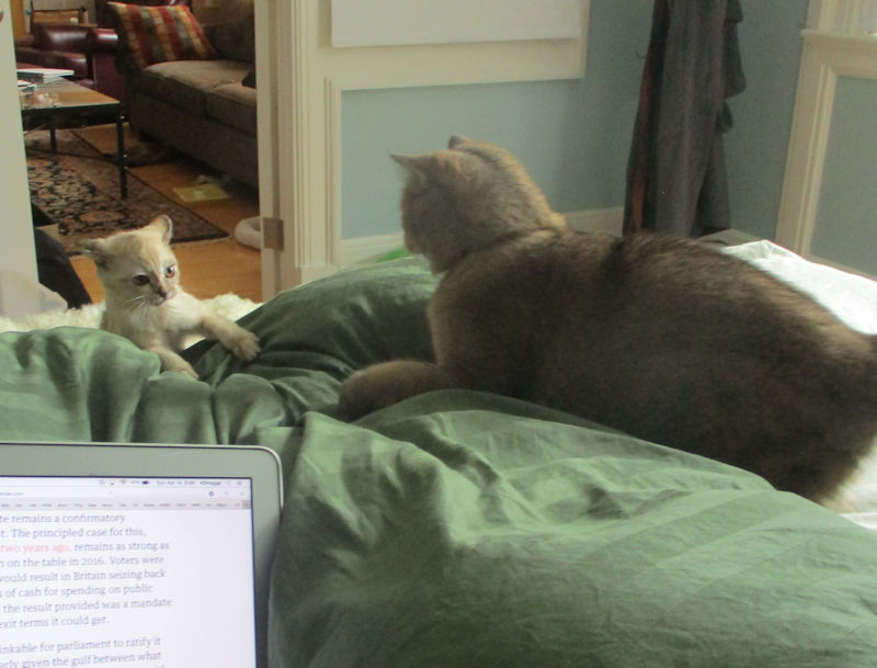 Choupette came to us on 3 April 2019, and within a week and a half she and Melvin had worked out a non-stop sophisticated form of ritual mock combat, one that features flying ambushes from behind, acrobatic midair counterattacks, takedowns and body slams, and both teeth and claws bared menacingly but retracted at exactly the right instant. This epic battle occurred on 14 April 2019.