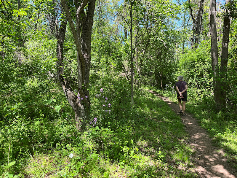 We're here at the well-planned trails in the overgrown woods of Staunton's Montgomery Hall Park, and we commence with an exuberant trot down the Scout (or 'Blue') trail, bound for the new liaison path up the Fern Gulley.