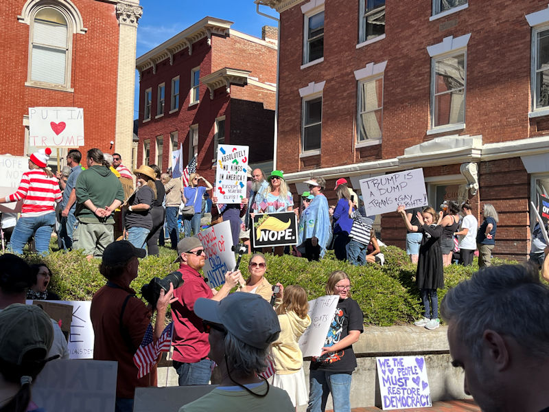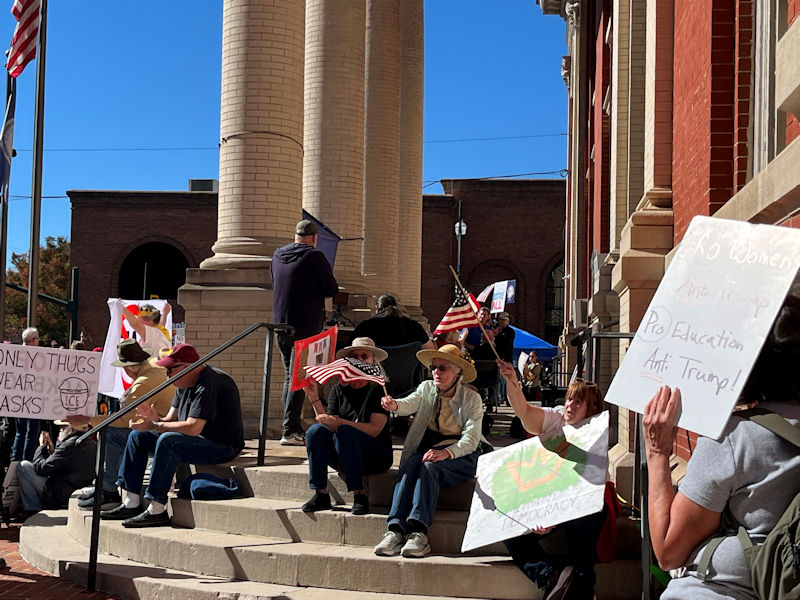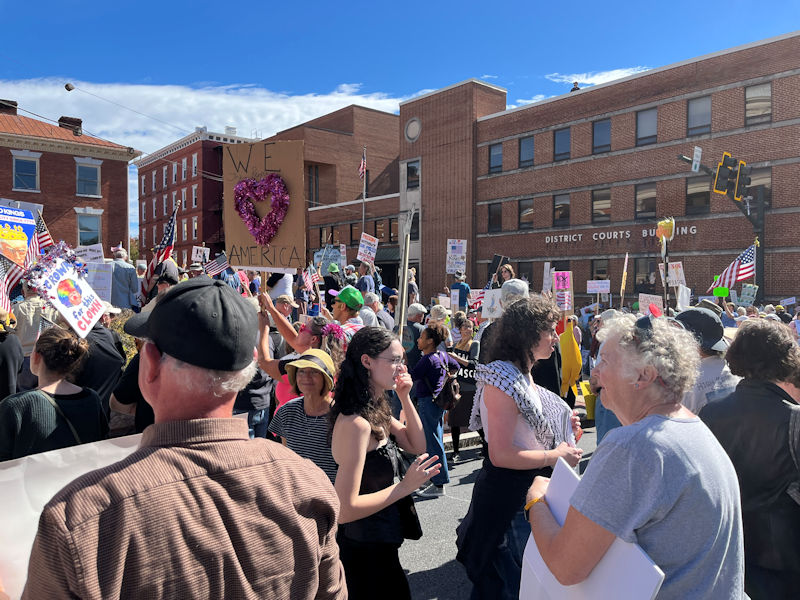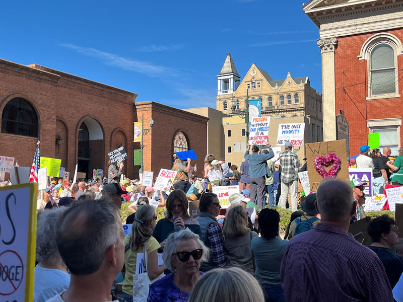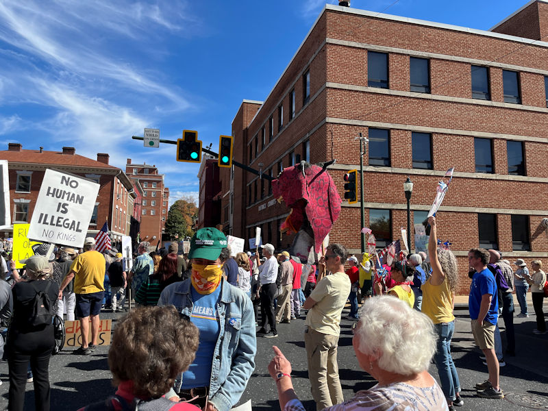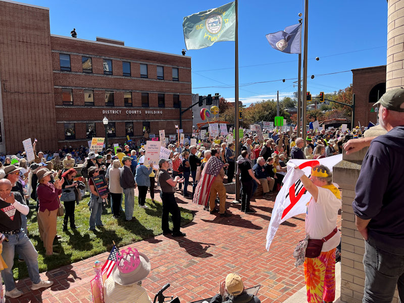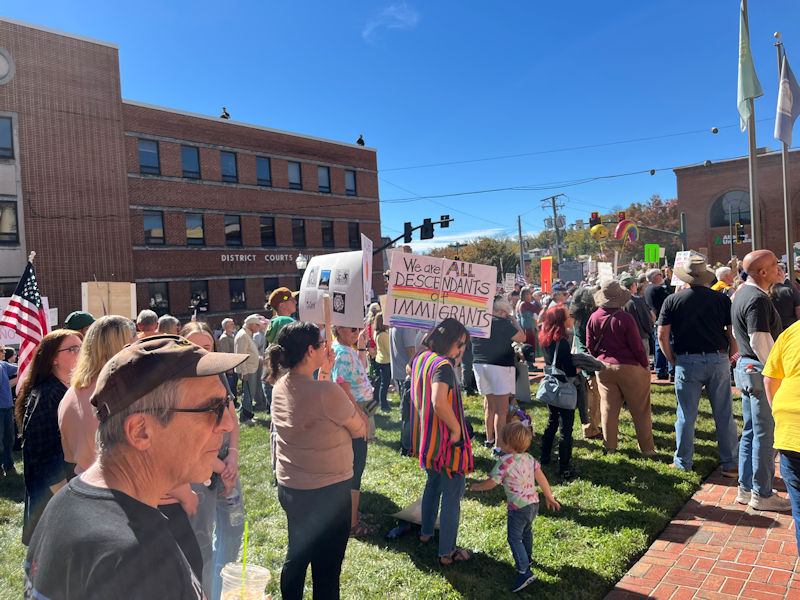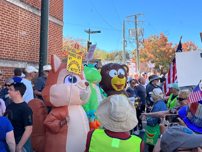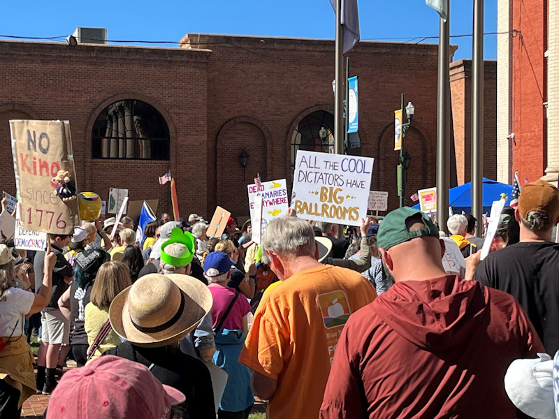 The first 'No Kings' demonstration was held in the same venue on 14 June 2025, reportedly with good attendance, but we were halfway across the country and missed it here. Today, however, here we are for 'No Kings II', 18 October, and we learn from reports of the many other demonstrations round the country, estimated at 2,700 of them with an estimated turnout of some 7 million patriotic citizens, it's all been hugely successful -- with a general atmosphere both joyful at the camaraderie of the participants and a range of serious grievances against the present lawless regime.