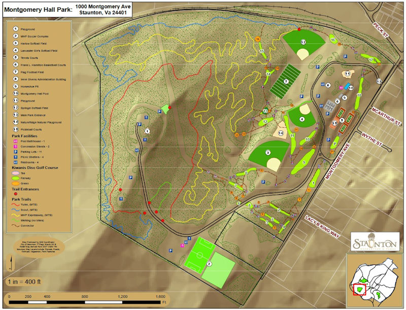 Montgomery Hall Park trails: Scout in blue, convoluted Expressway in yellow, and simple Yulee in red (a few unofficial crossovers & the Fern Gulley are not shown).