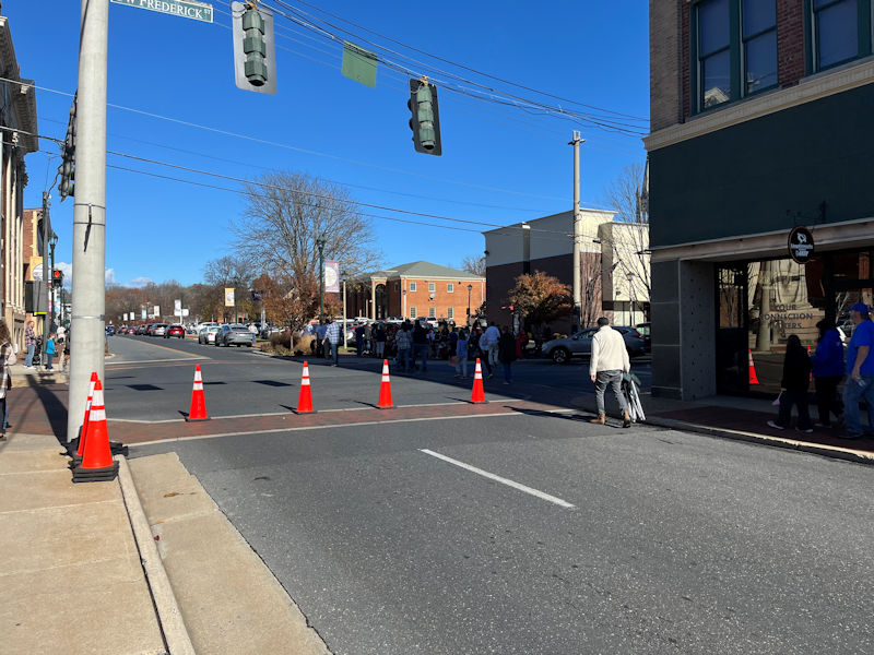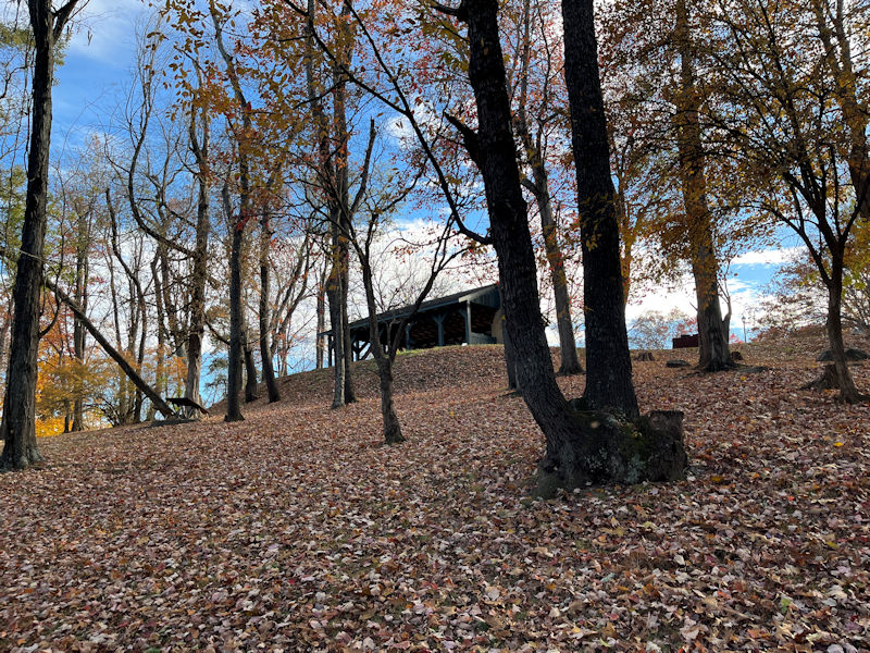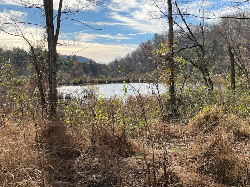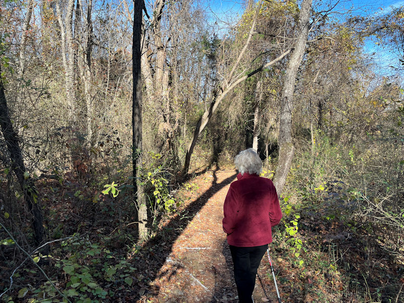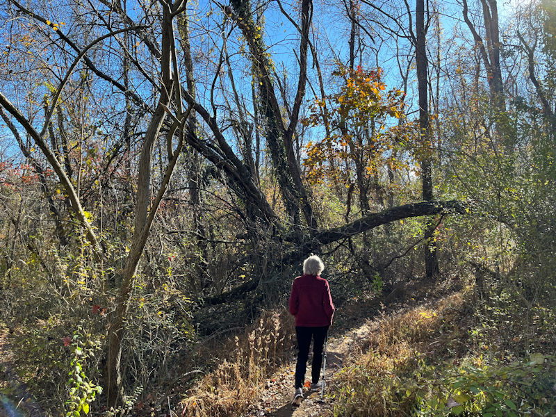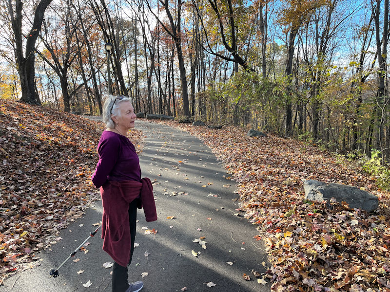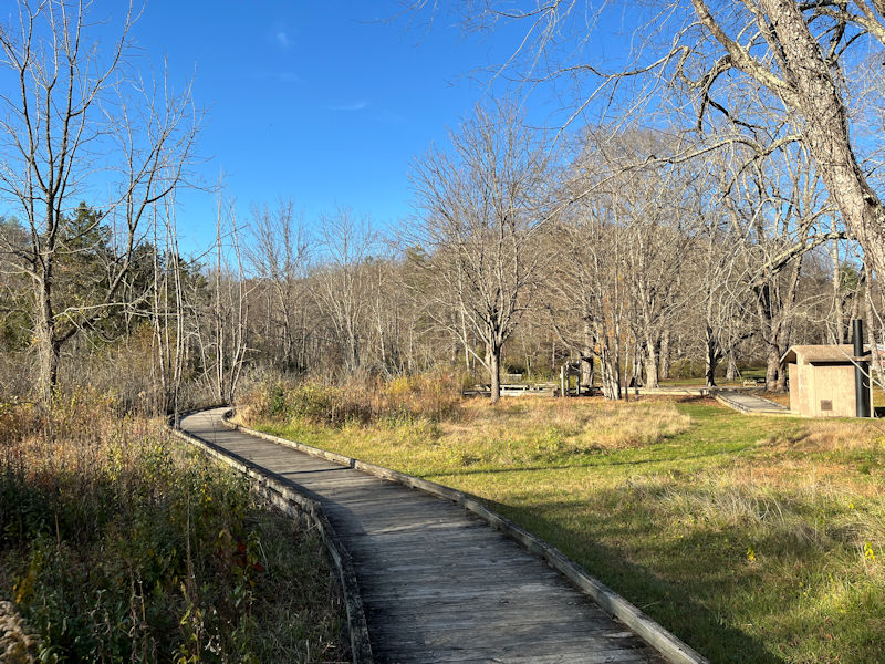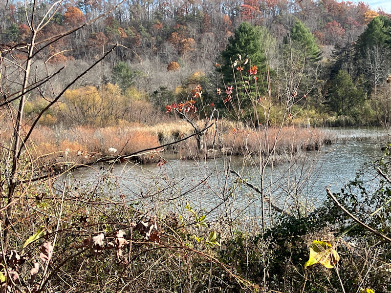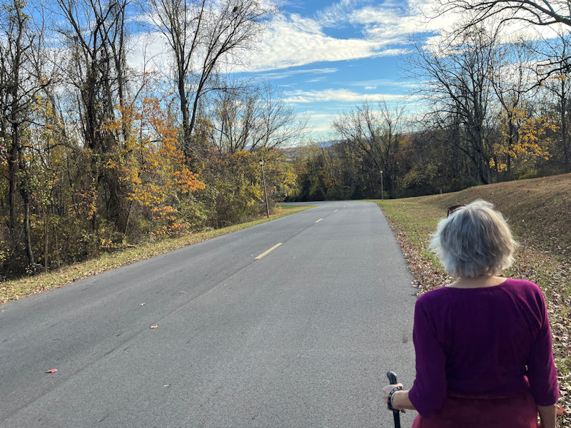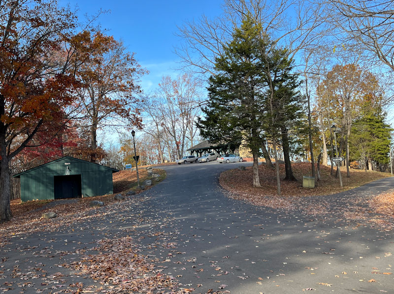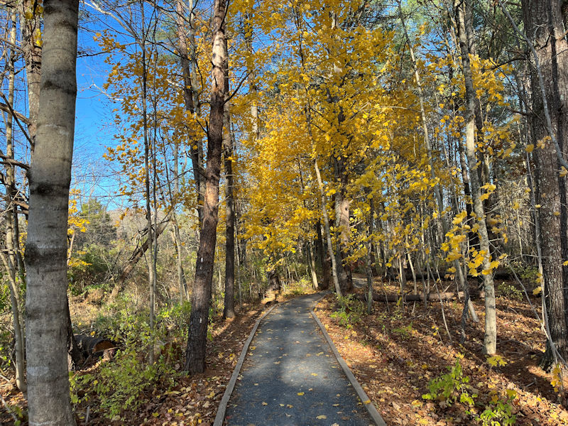 Montgomery Hall Park in Staunton VA, the informal entrance from the southern carpark, 4 November 2025. The little iPhone camera is all charged up.