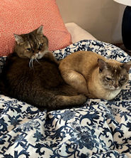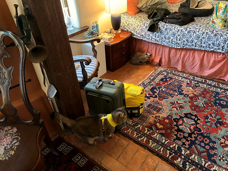 Cats happily divested of their traveling harnesses and leashes