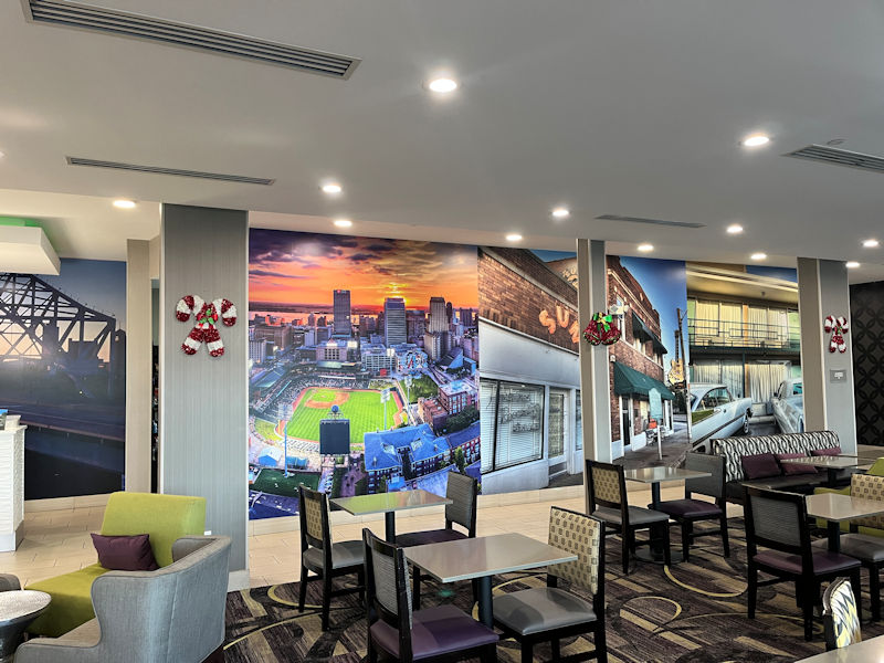 A festive and well-appointed lobby-cum-breakfast room. La Quinta breakfasts are not bad at all (especially if you really like waffles a lot), but we normally, in our haste, just thermo up on the coffee and hit the road till lunchtime.