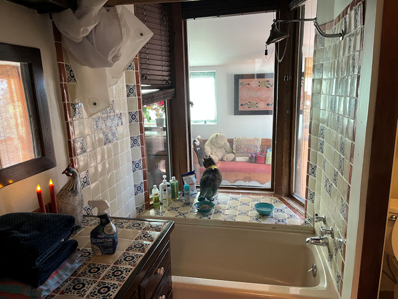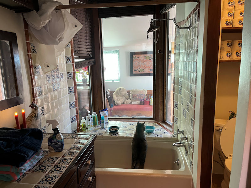 He's as confused by big windows next to the bathtub as we are.