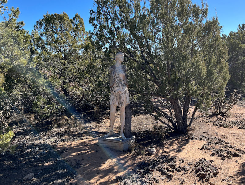 An enigmatic presence near the bottom of the property -- a classical-looking figure draped with a fabric cloak.