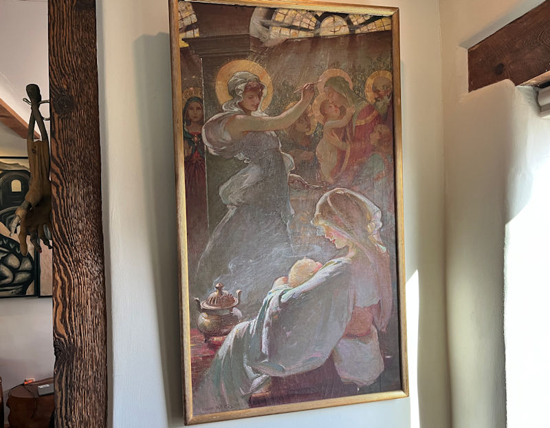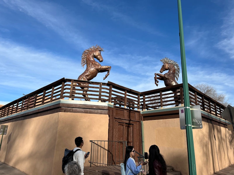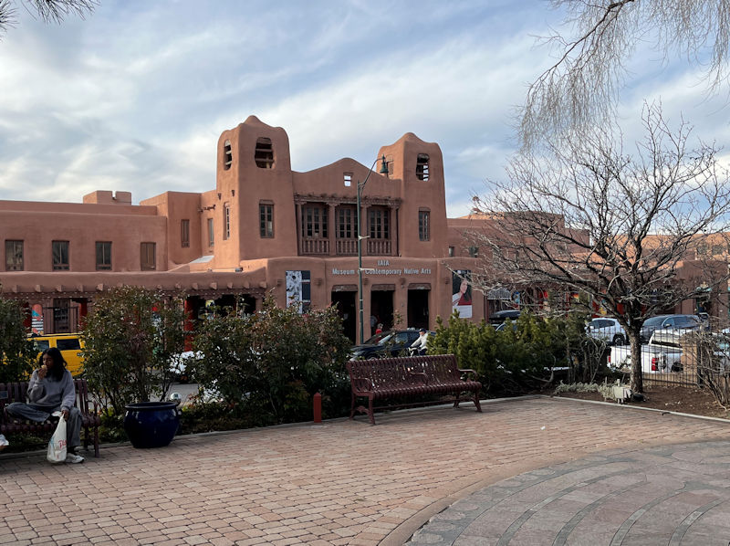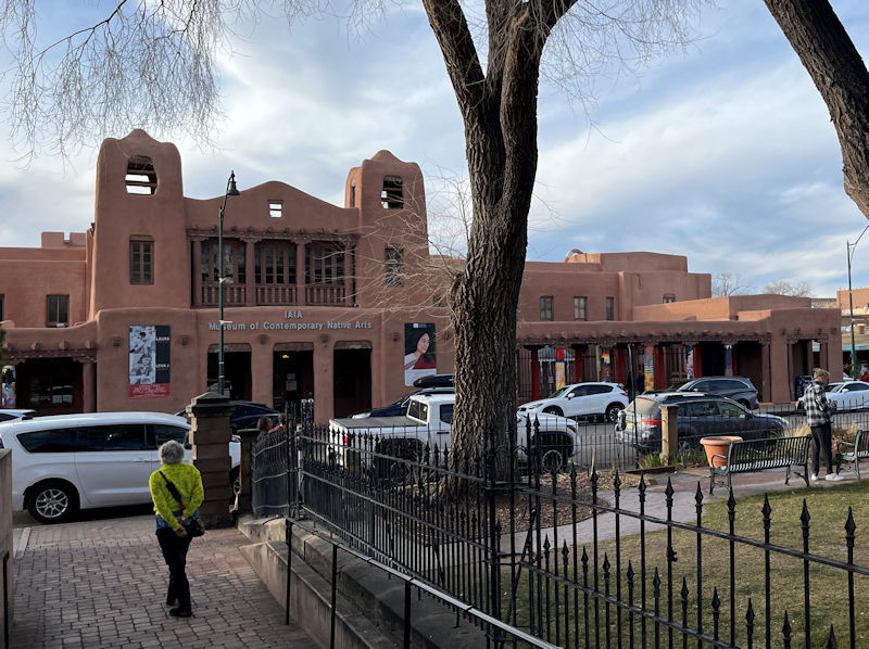 Across the street, that's the Museum of Contemporary Native Arts, in appropriate adobe style. During a decline in the city's fortunes in the late 19th century, it was determined that henceforward it should 1) emphasize an appropriate uniform architectural style, and 2) lean heavily into the cultural virtues of its Indigenous, Spanish, and American heritages.