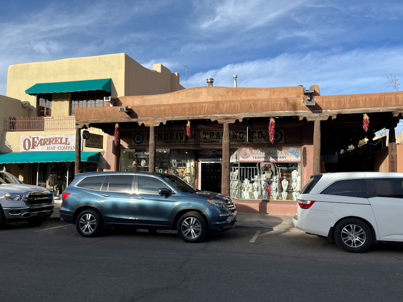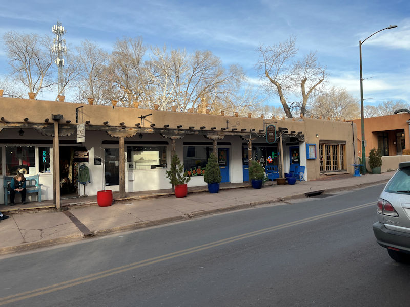 The classic Pueblo Revival style (with a photography shop and the Palacio Restaurant (this is after all E. Palace St))