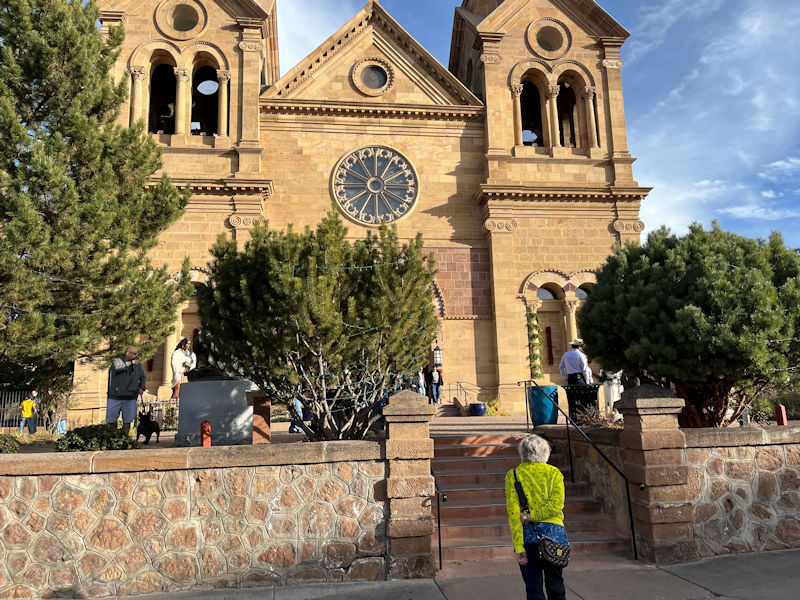 The Frenchman Jean-Baptiste Lamy (1814-1888) was assigned to Santa Fe in 1851, and he created the cathedral in 1869 in a French Romanesque Revival style, employing French architects and Italian stone masons (standing well out from the adobe styles of this region); it was dedicated in 1887. A 1915 bronze statue of the good archibishop is seen here in front of the door.
