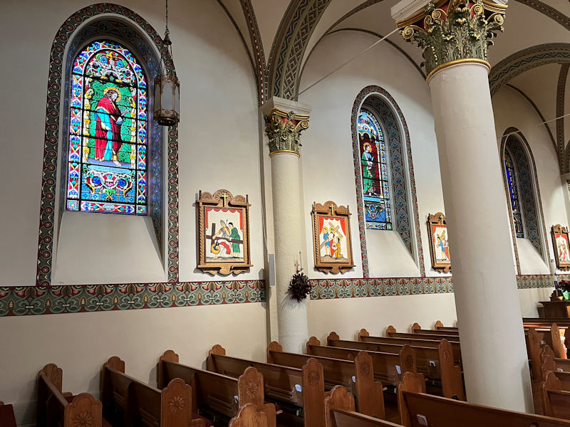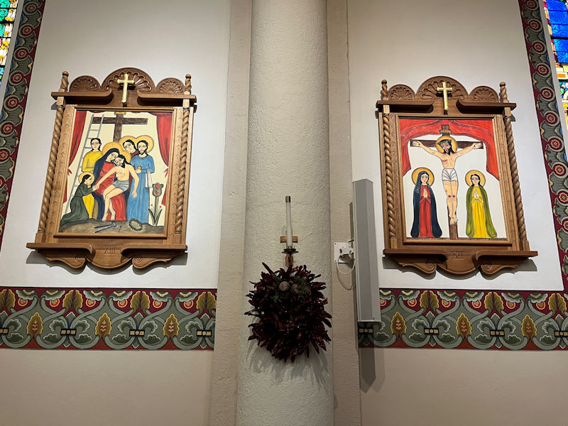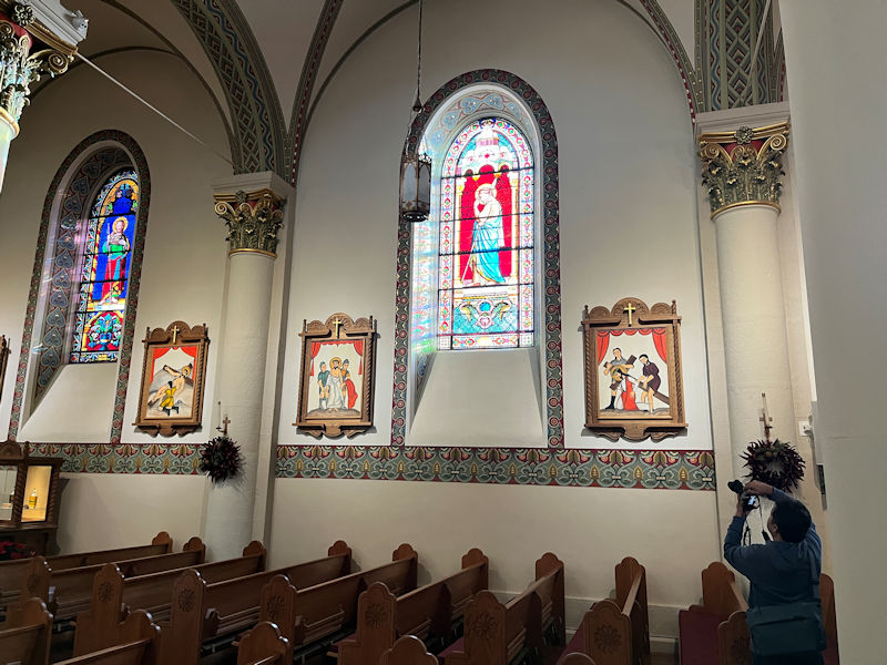 The illustrations of the Stations of the Cross. The decision to paint the walls white was taken in the 19th century, but in 1997 the then-Archbishop Sheehan endeavored to restore the interior to its original design and employed the American Marie Romero Cash to create these in the 'Santero' style.