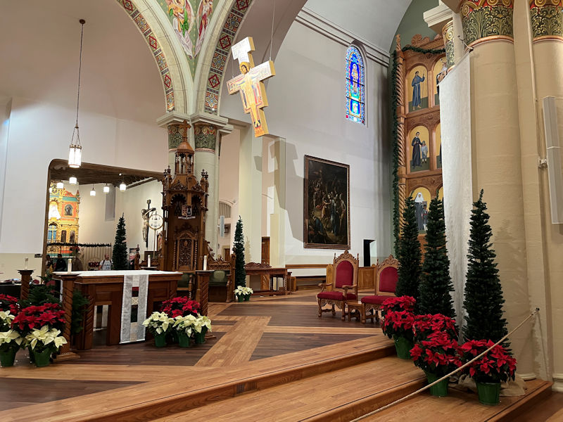 In the sanctuary, the screen (or reredos) behind the altar, created in 1986 for the cathedral's 100th anniversary, has an 18th century statue of St Francis in the centre, with painted images of saints of the New World all round him. The dangling crucifix above the altar is said to be a replica of the one in Assisi from which Christ spoke to St Francis, and like that one it's called the 'San Damiano Crucifix'.