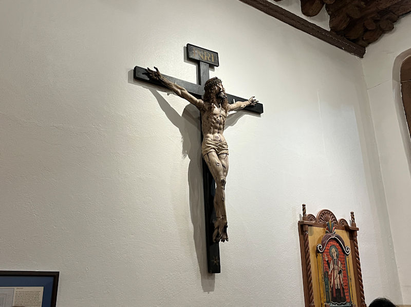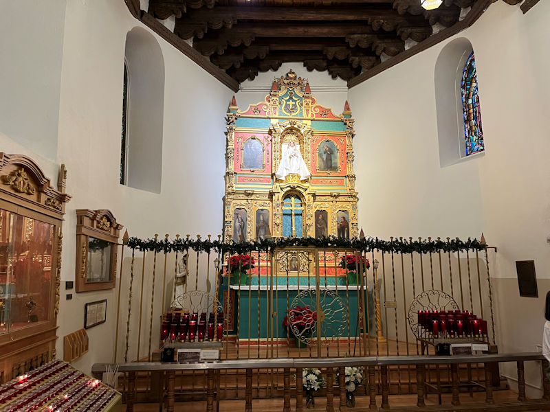This is called the Conquistadora Chapel in the north (or left) transept, brought forward from the earlier Parroquia Church from 1717. The Conquistadora is a wooden statue of the Madonna carried by missionaries from Spain in 1626. During the Pueblo Revolt of 1680, when the Spaniards had to retreat south into Mexico proper, they brought it with them, and when they were able to end the revolt and return in 1693, they thought of that as a 'Reconquista', and thus she became La Conquistadora, said to be the oldest Virgin Mary statue in the US.