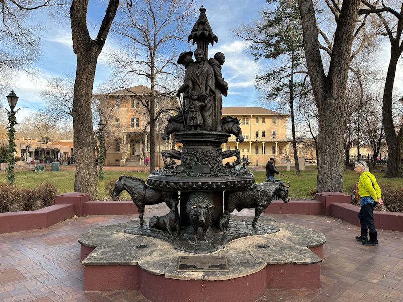 It's known as the 'Santa Fe Pioneer Monument', i.e. in honor of 'the Spanish colonists of 1598' and the Franciscan missionaries who came with them. The various people-types and animals on this side are matched by others on the far side (which we'll come to see in a few days).