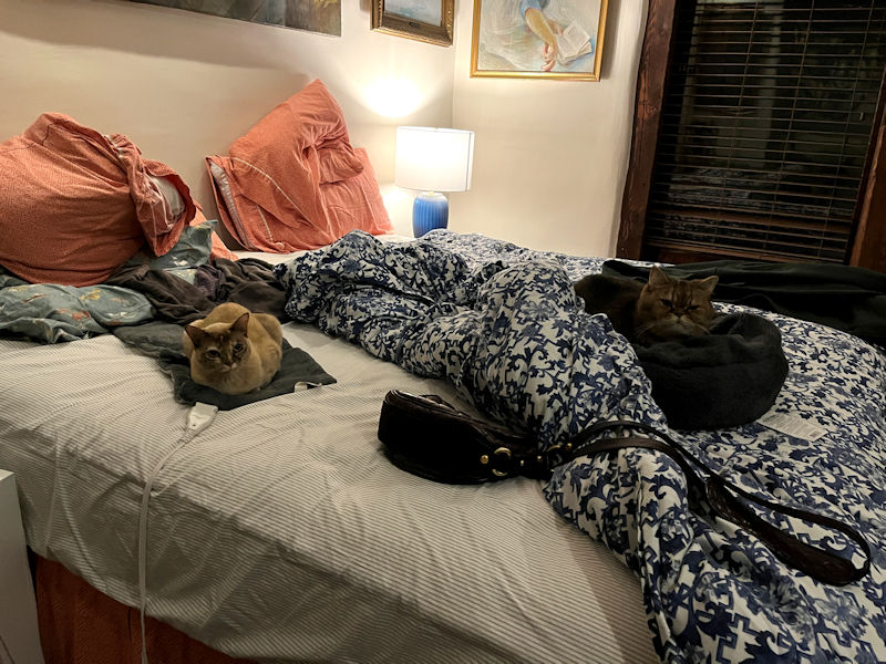 Night time for kitty cats (one chooses the blue catbed, the other prefers the heating pad)