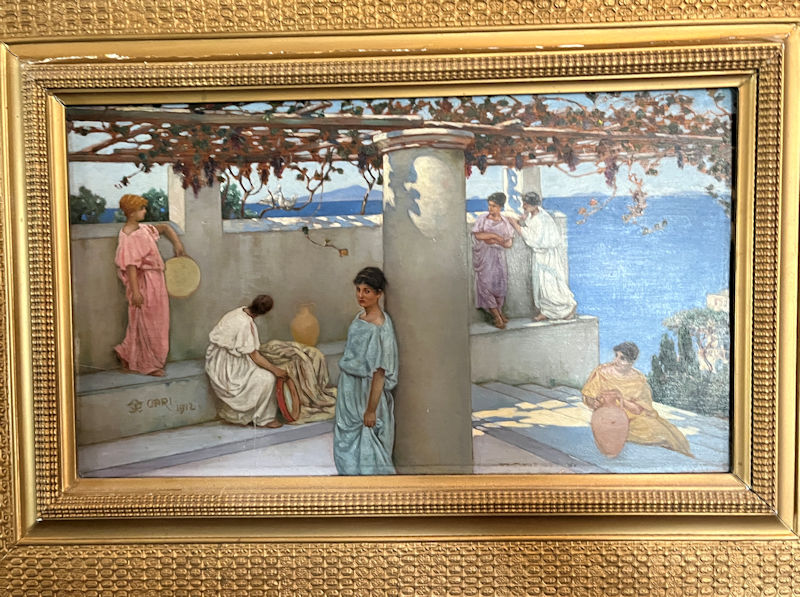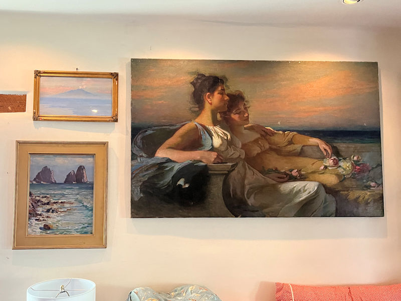 Artworks everywhere. Vesuvius above left, two reclining ladies on the right, and (on the lower left) the Faraglioni rocks off the southern coast of Capri.