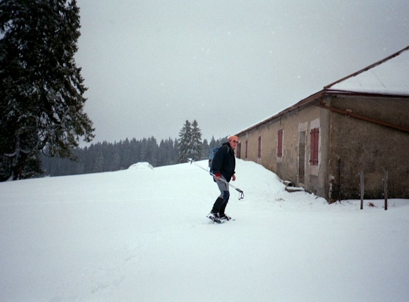 The narrator scootling painfully on a broken snowshoe to the farm of Haut Mont, 10 February 2002