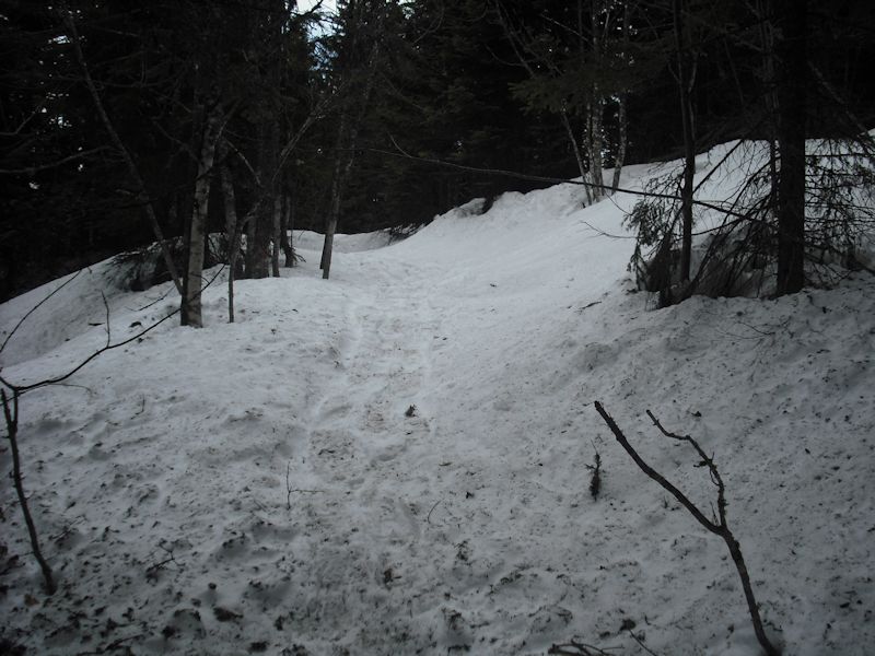 The narrow southwestern far end of the Pré de Rolle, at about 1300m, with various old snowshoe and ski tracks preceding us.