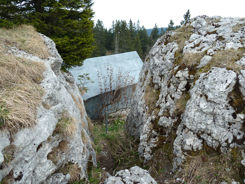 A Creux d'Enfer is an expansive jumbly limestone hollow with holes in it, and the Creux d'Enfer de Druchaux runs crookedly up northwestward between the headland pastures of Druchaux and the massif of Mont Tendre.
