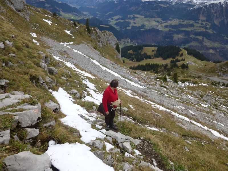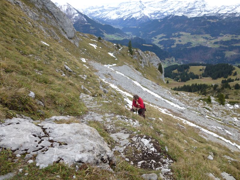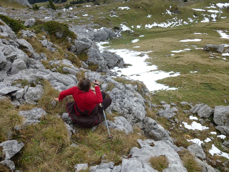 But then daunted. Kristin pathfinding a comfortable way down as raindrops plunk down on our heads.