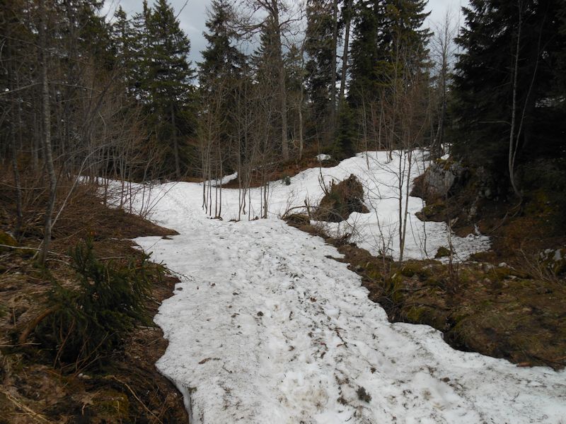 We start at 1200m. It's tradition: by early- or mid-April the car can get partway up the Route des Montagnes in the Côte de Bière, and from there you have to walk up to the snow. (This year it's the end of April.)