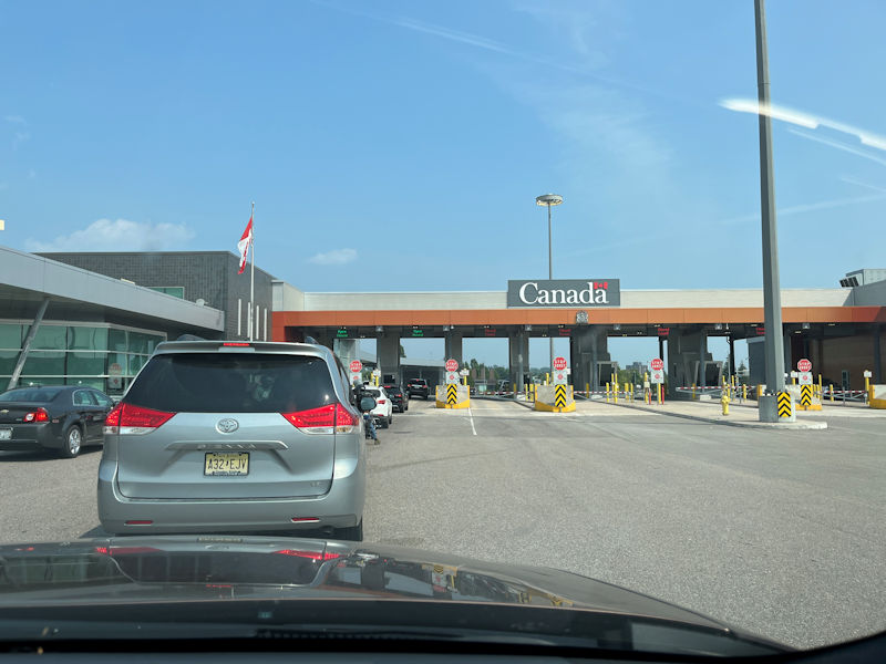 . . . the Canadian entry station, only slightly backed up ('carrying any firearms?', 'Welcome to Canada'). The US entry station is back on the USA side on the other highway lane.