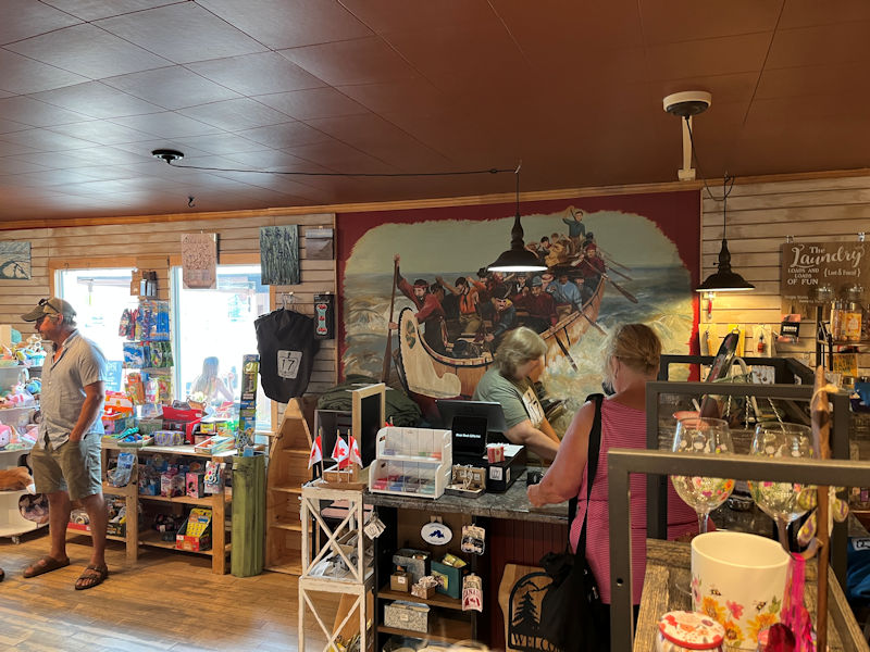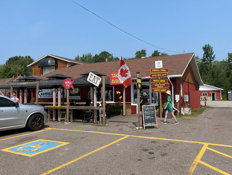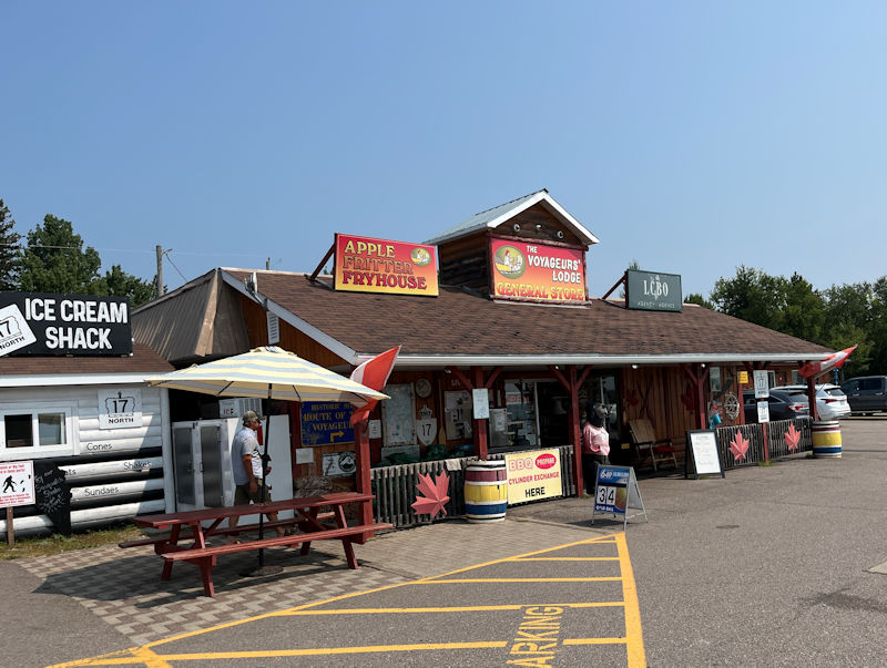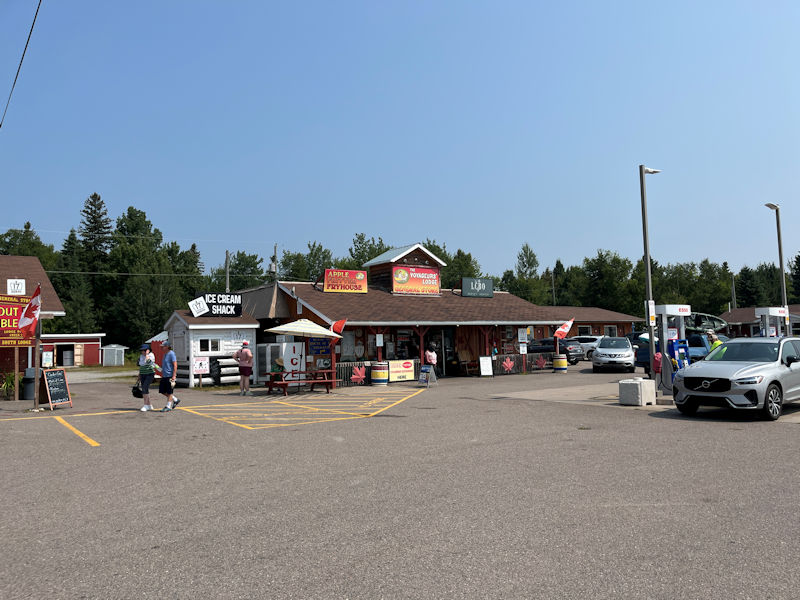 The Voyageur's Lodge [i.e. motel] and Cookhouse just up the road, as well as The Voyageurs' General Store and Apple Fritter Fryhouse. The Ice Cream Shack is an add-on, and the gas pumps are still called 'Esso', which is okay but a surprise.