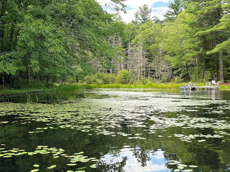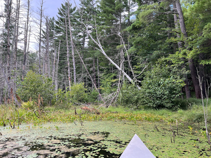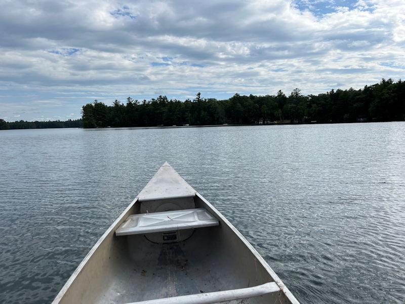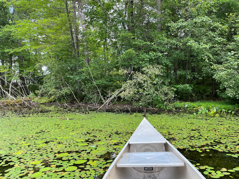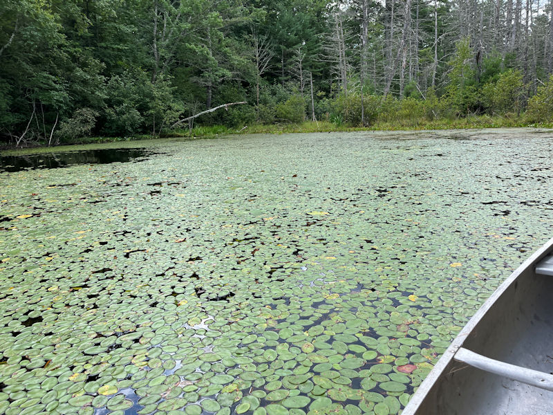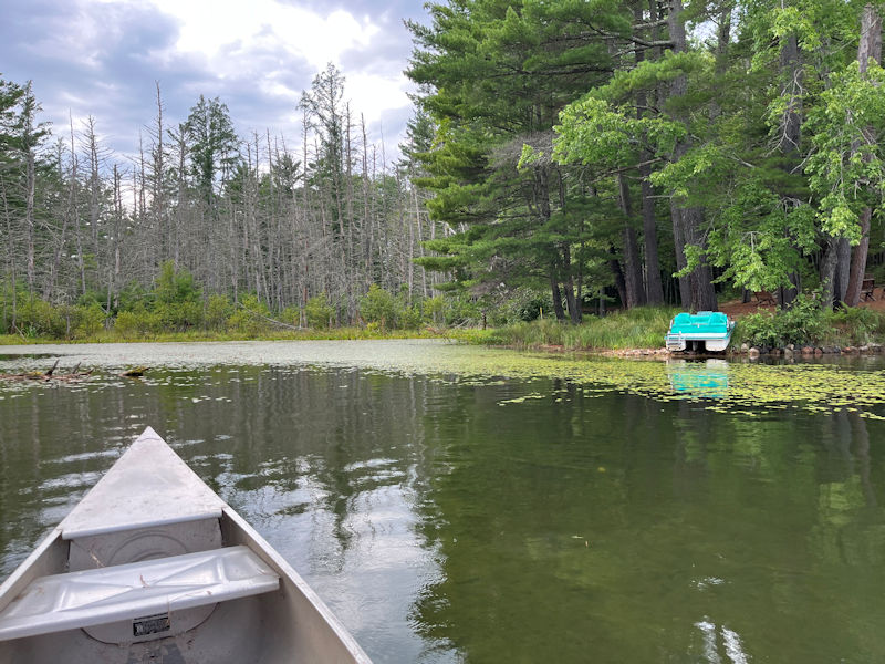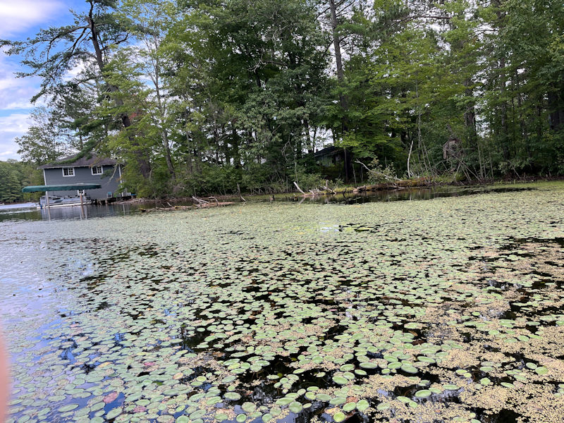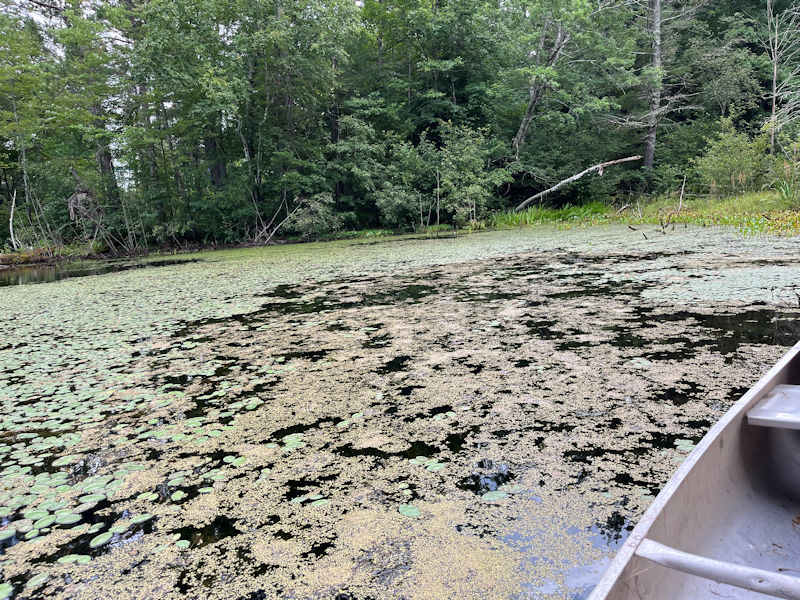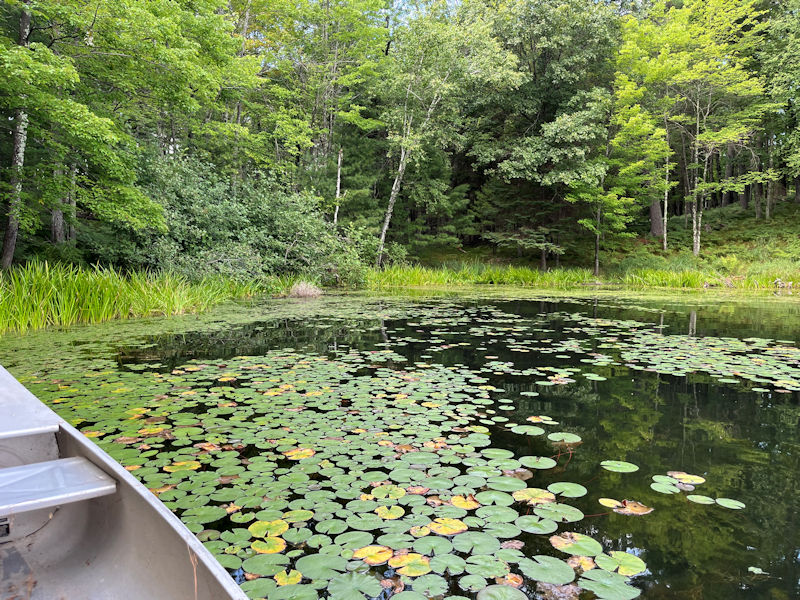 This apparently open water has in recent years been incrementally choking up with submerged 'muskie weed' or 'pondweed', spreading across the non-lily pad side of the cove -- a grand nuisance for the boatowners along that shoreline. On this trip in, however, we noticed that those submerged plants are much less evident, and we've just learnt that someone has doused them with a toxic herbicide. Big bummer.