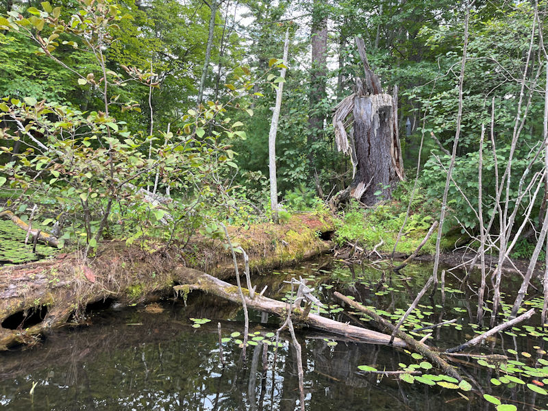 The poor, sadly decomposing old forest-warrior is still forming, 15 years later, a virtual gate across half the cove.