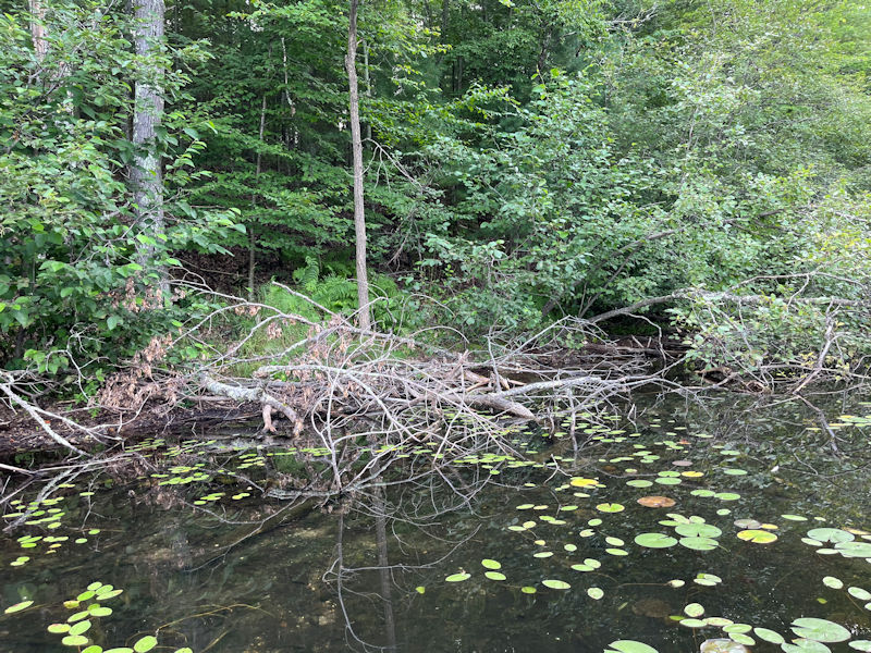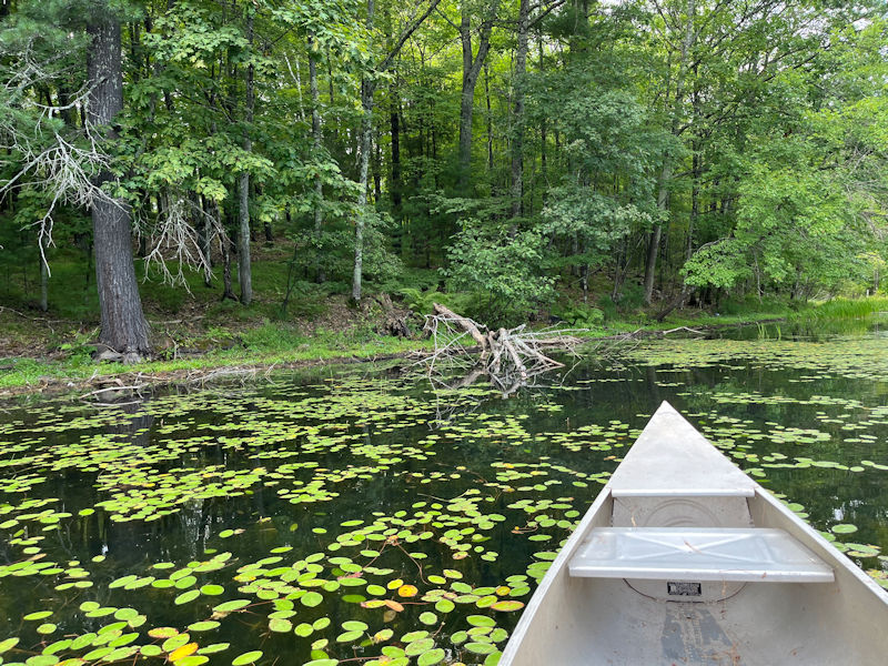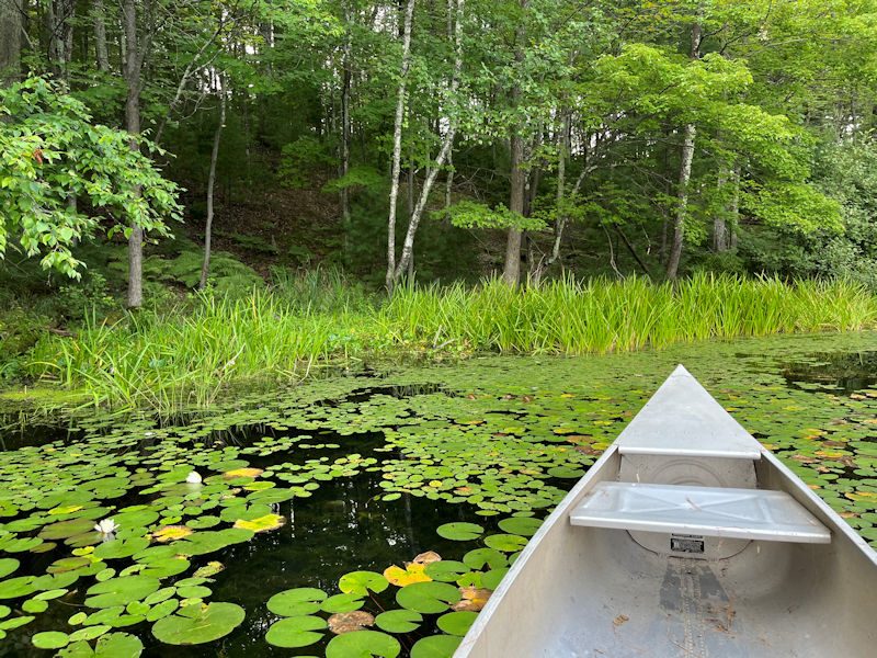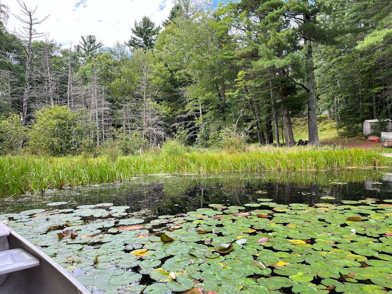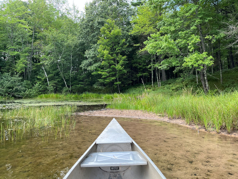 This lake is basically spring fed, sometimes from under water but often from mini-creeks entering from the forests. Over the years, when those creeks reach the shoreline, they tend to spread out and make a small marshy delta -- these are uninvestigable on hydrobikes (they would take 3 seconds to lock up the propeller), but at least once a summer we enjoy paying them a visit in the old Grumman canoe.