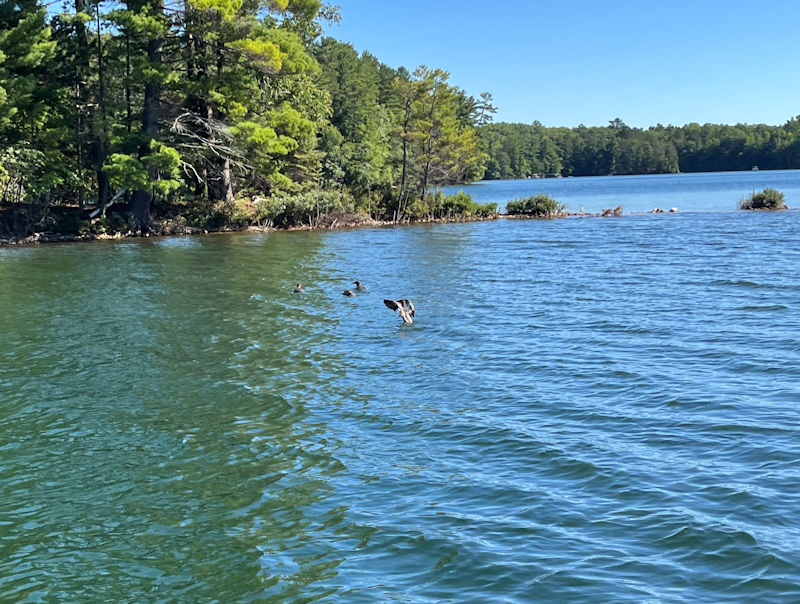 This is our new friend (who we understood to be 'Gary, the retired DJ') who summers across the lake by Tomahawk Bay and, this year, has been coasting slowly round the entire shoreline between 3 and 4 every afternoon. His boat's maker is called Calabria, but it surely doesn't come from southern Italy. Now we chat fairly regularly on the lake.